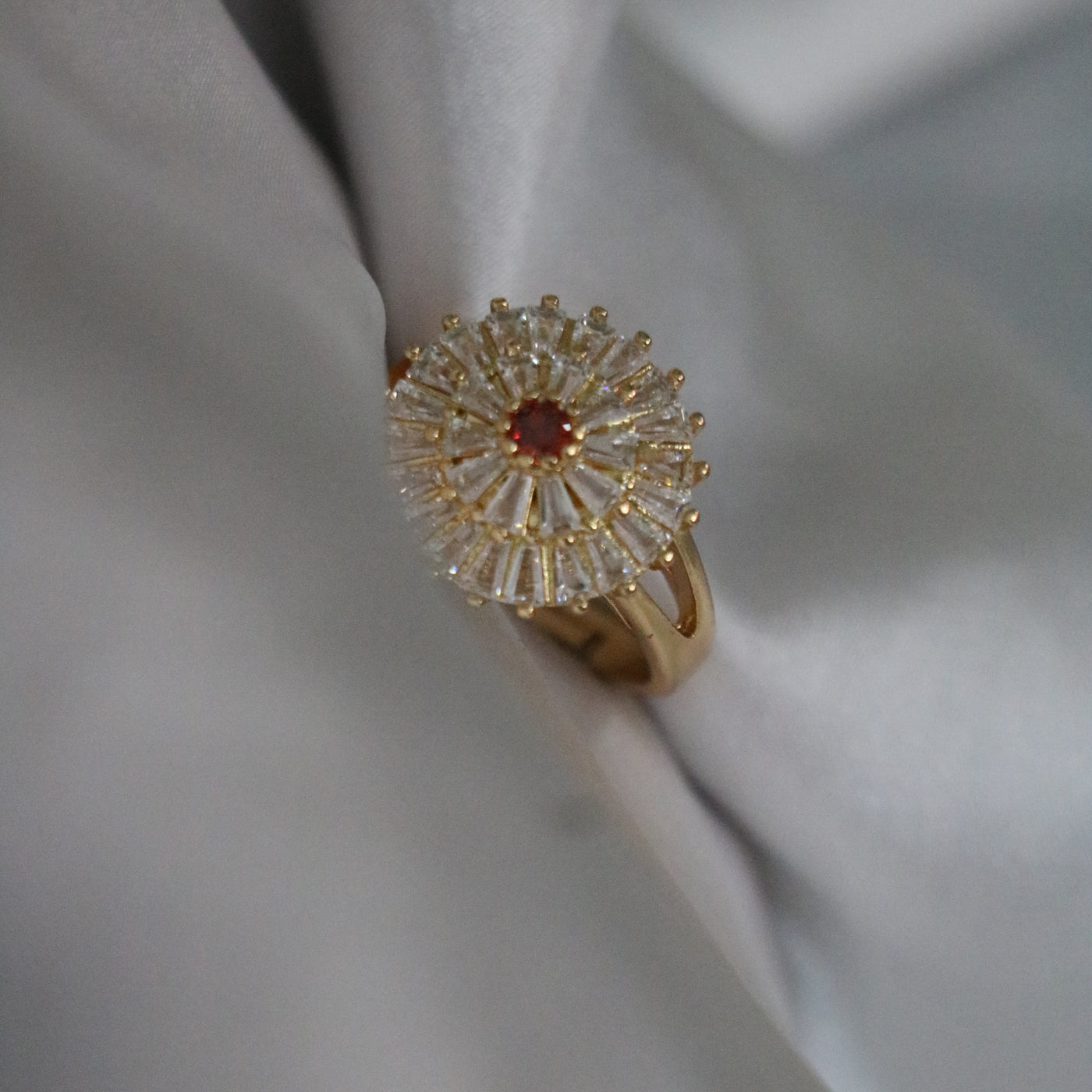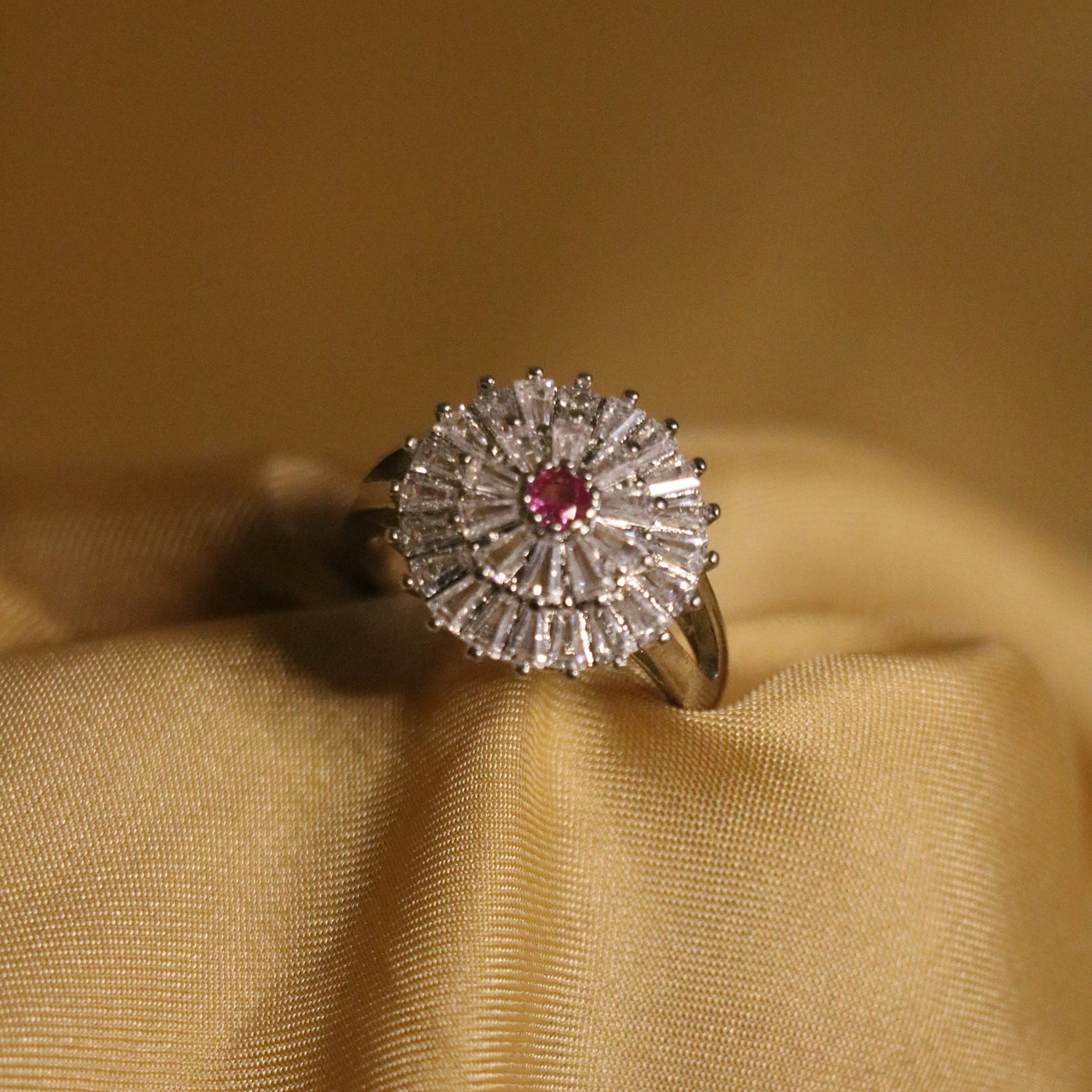 Add a touch of luxury to your jewelry collection with this stunning sunburst ring, available in gold-plated and silver-plated finishes. Featuring an intricate design adorned with sparkling stones and a bold red center stone, this ring is perfect for making a statement. Ideal for Eid, weddings, or everyday elegance, it combines timeless style with modern sophistication.