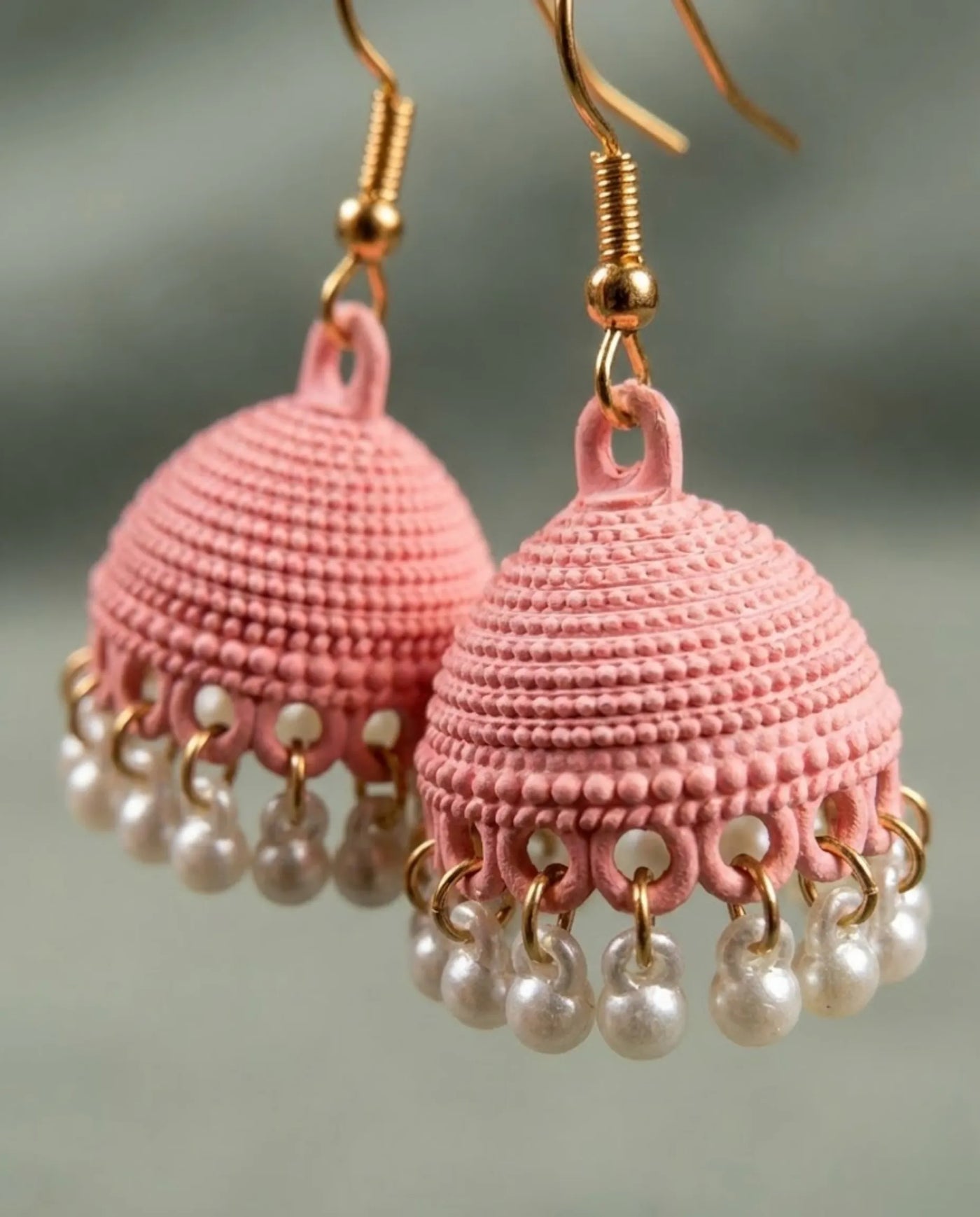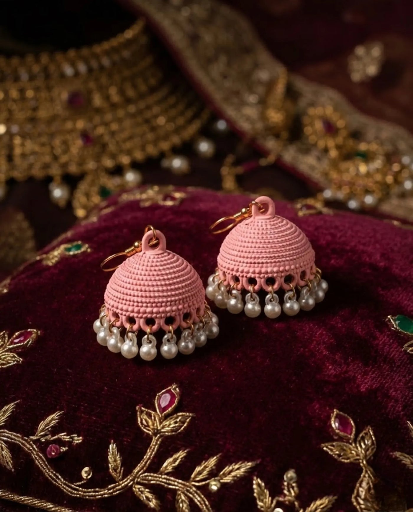 Accented with a delicate row of pristine white pearls, each movement creates a graceful sway that exudes effortless glamour. Whether you are dressing for a sun-drenched daytime dholak or a refined evening tea, these jhumkas add a touch of modern luxury that complements the radiant spirit of the modern Pakistani woman.