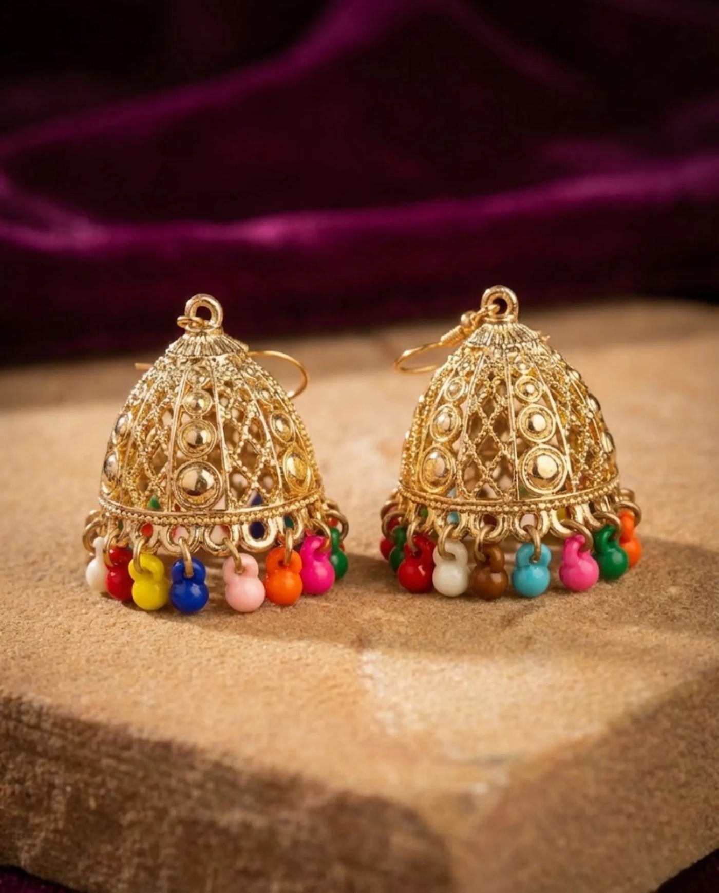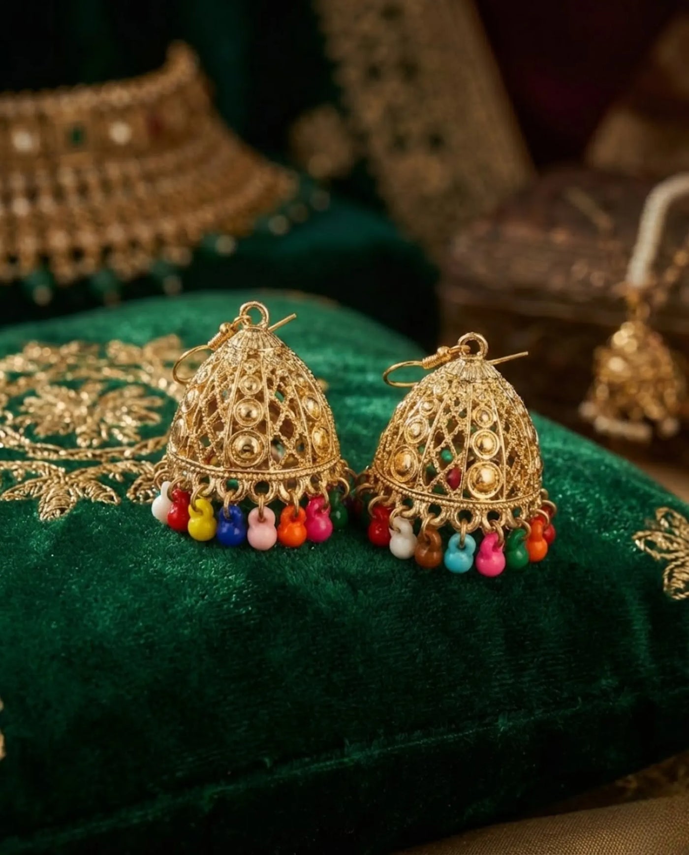Step into the spotlight with a masterpiece that bridges the gap between timeless heritage and contemporary glamour. These Orneza jhumkas are meticulously crafted with an intricate gold-tone filigree dome, reflecting the architectural beauty of traditional artistry while maintaining a lightweight, modern feel.
