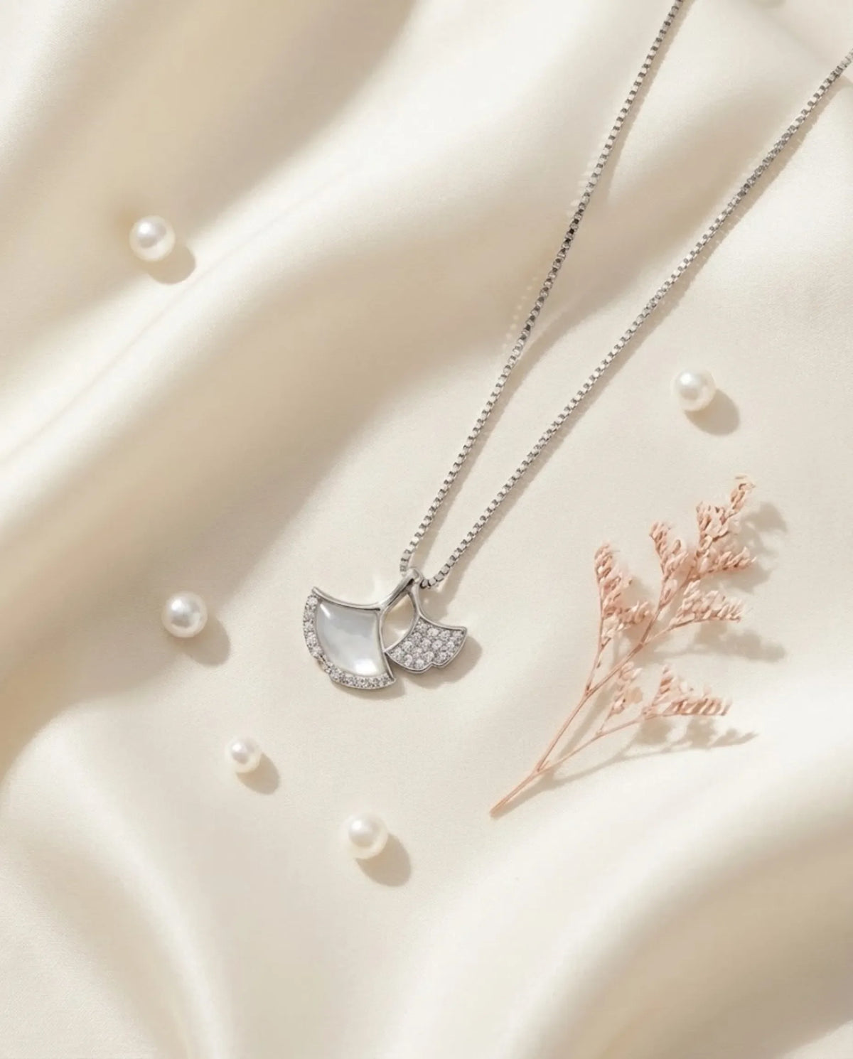 Grace meets modern artistry in this captivating Orneza creation. The pendant features a uniquely sculpted ginkgo fan silhouette, adorned with a lustrous shell inlay that radiates a soft, iridescent glow. This delicate organic element is paired with a brilliant spray of pavé-set zircons along the edge, creating a harmonious balance between natural beauty and high-fashion sparkle that defines the confident woman.