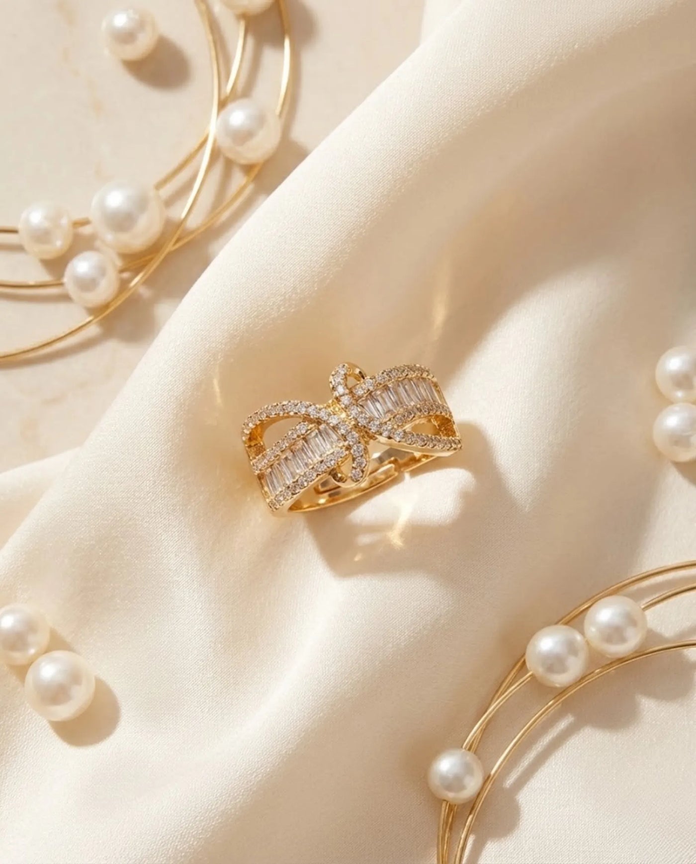Orneza Gilded Bow Baguette Crystal Statement Ring