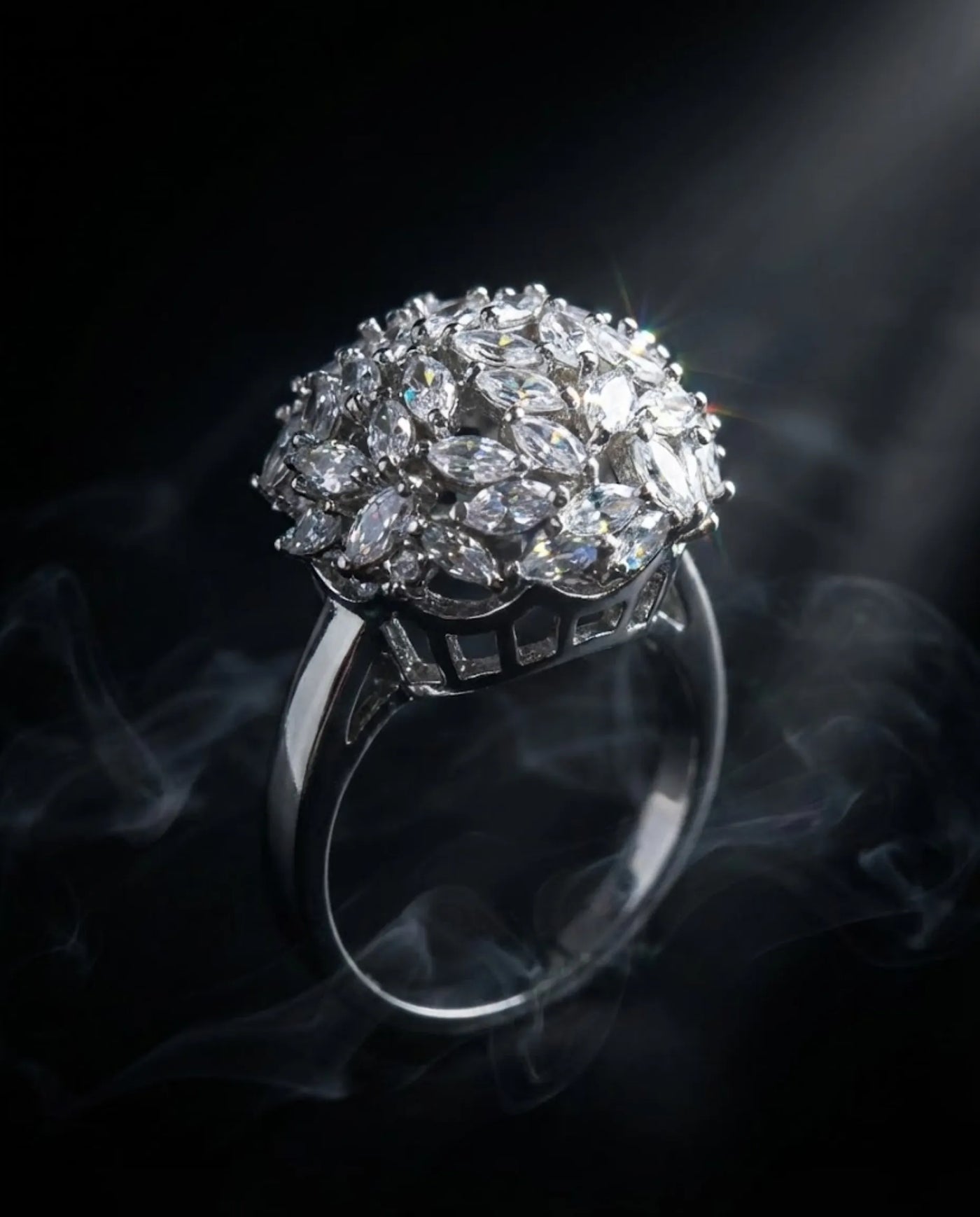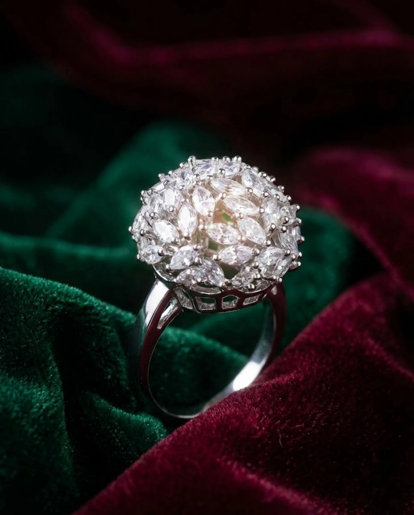 The intricate craftsmanship of this statement piece lies in its high-profile cluster setting, where each individual stone is secured in a delicate silver-toned gallery. This elevation allows for maximum light exposure, ensuring a diamond-like fire that remains unrivaled during grand evening celebrations or intimate soirées. Whether you are gracing a red-carpet event in Karachi or a high-profile dinner in Lahore, this ring serves as your ultimate signature of sophistication and unapologetic style.